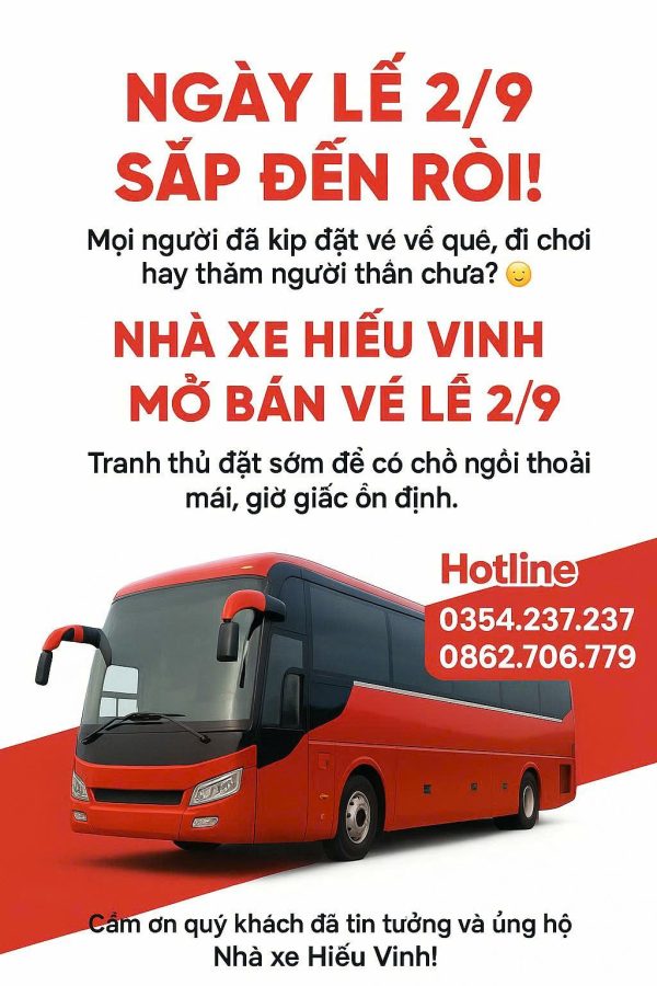 - Thông tin liên hệ: Giá vé: 200.000 VNĐ. Chi tiết về địa chỉ và số điện thoại cụ thể của nhà xe Hiếu Vinh không được cung cấp trong thông tin nghiên cứu. Để đặt vé và biết lịch trình chi tiết, quý khách có thể liên hệ hotline 0828211222.